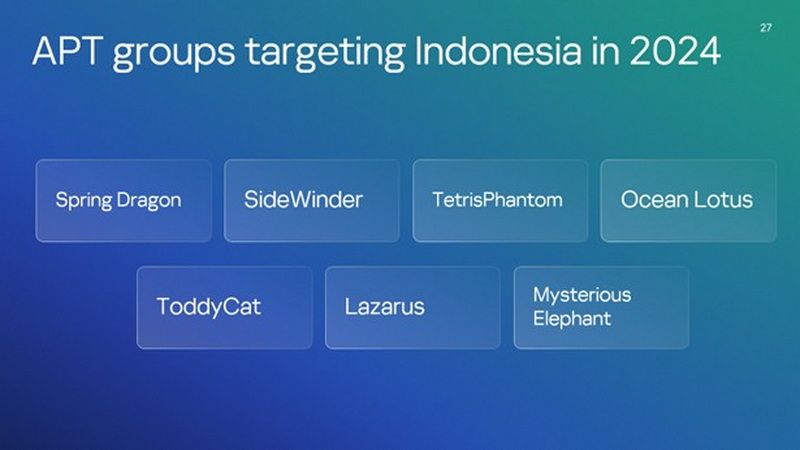 Kelompok APT yang menargetkan Indonesia pada tahun 2024 menurut Kaspersky antara lain Mysterious Elephant, Spring Dragon, Ocean Lotus, Toddycat, Lazarus, Tetris Phantom, dan Sidewinder.