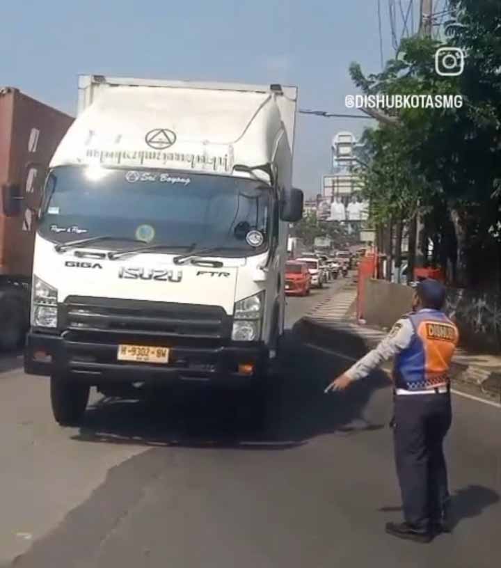 Semarang | Di tengah terik matahari yang menyengat, sejumlah personel Dinas Perhubungan (Dishub) Kota Semarang berdiri tegap di tepi jalan, menghadang satu per satu truk sumbu tiga yang hendak melintasi jalur tanjakan Silayur menuju kawasan pergudangan BSB City.