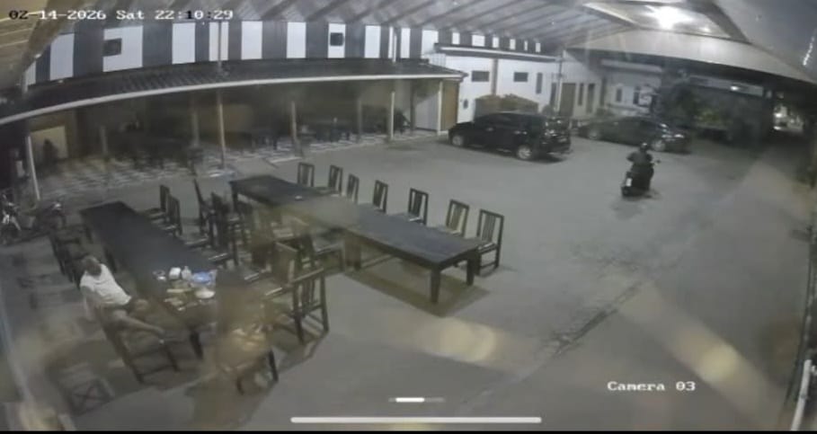 Kemudian, terduga pelaku tersebut memutar balikan kendaraanya ke arah gerbang keluar rumah. Selanjutnya, pelaku mengeluarkan pistol dan menembakanya ke arah atas dinding teras rumah sebanyak satu kali tembakan dengan menggunakan tangan kanannya, kemudian pergi menuju ke arah utara.