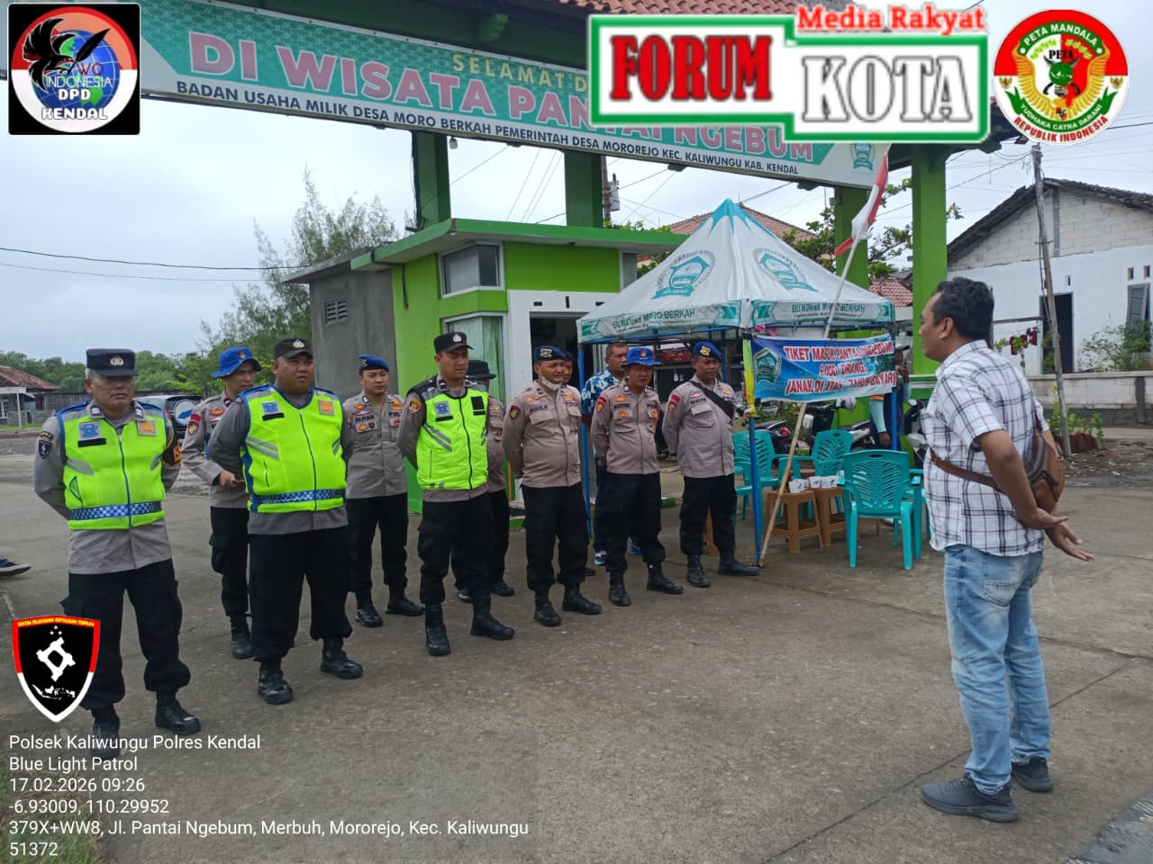 FORUM KOTA.ID ,KENDAL — Polsek Kaliwungu melaksanakan patroli di objek wisata Pantai Ngebum, Desa Mororejo, Kecamatan Kaliwungu, dan komplek Makam Sunan Katong area Jabal Nur, Desa Protomulyo, Kecamatan Kaliwungu Selatan, Kabupaten Kendal, Selasa (17/2/2026) pukul 09.00–10.30 WIB. Kegiatan ini dilakukan untuk menjaga keamanan dan ketertiban masyarakat di wilayah hukum Polsek Kaliwungu.