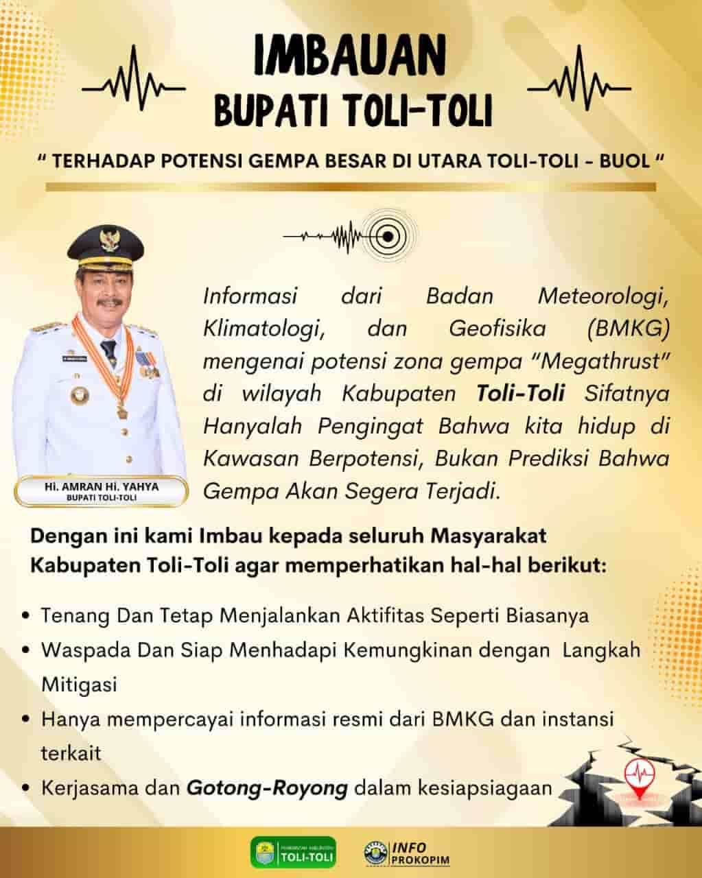 Tolitoli — Menyikapi informasi dari Badan Meteorologi, Klimatologi, dan Geofisika (BMKG) mengenai potensi zona gempa megathrust di wilayah utara Tolitoli–Buol, Bupati Tolitoli Hi. Amran Hi. Yahya menyampaikan imbauan resmi kepada seluruh masyarakat.
