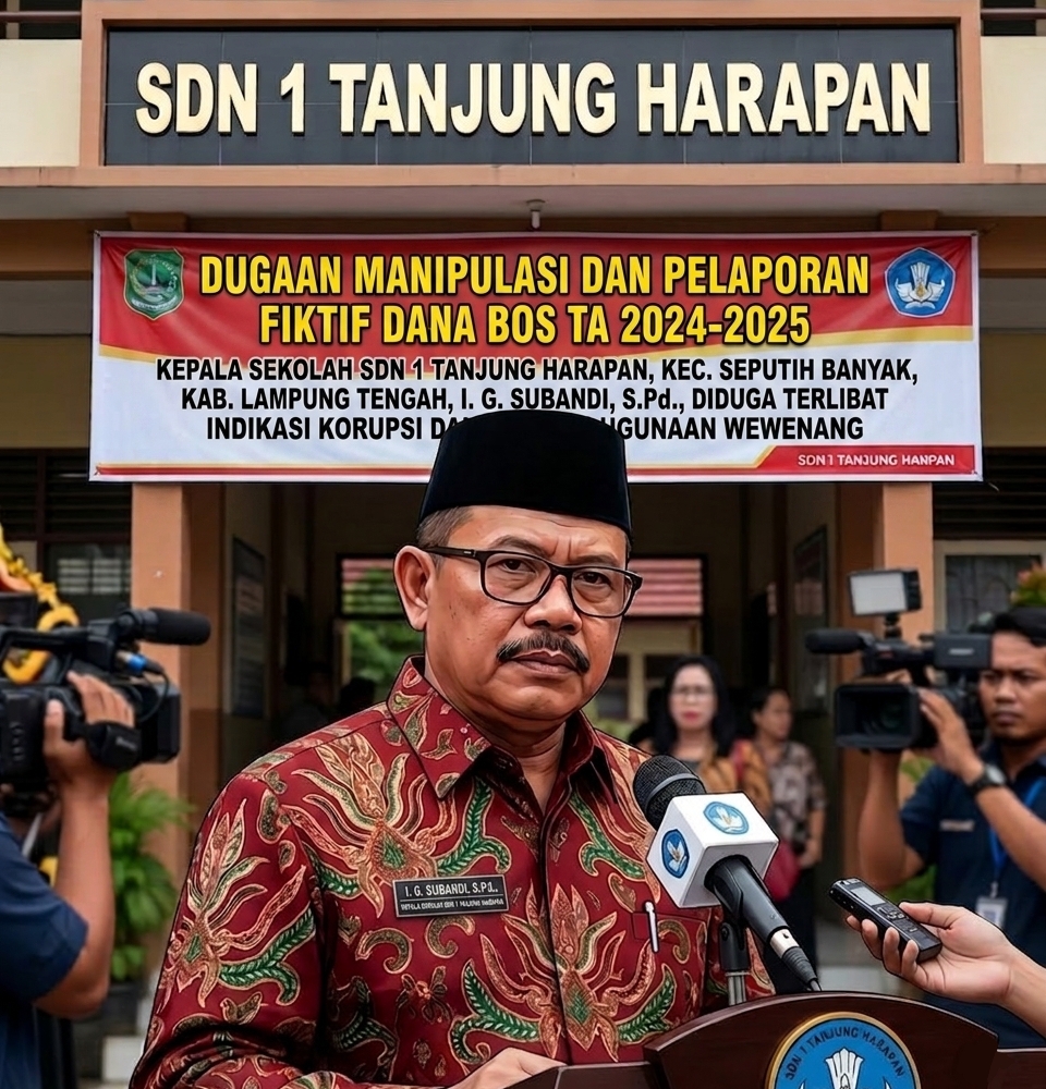 Kepala Sekolah SDN I Tanjung Harapan, Kecamatan Seputih Banyak, Kabupaten Lampung Tengah, I. G. Subandi, S.Pd., diduga melakukan pelaporan fiktif atau manipulasi dalam pertanggung jawaban penggunaan Dana Bantuan Operasional Sekolah (BOS) selama tahun anggaran 2024 hingga 2025.