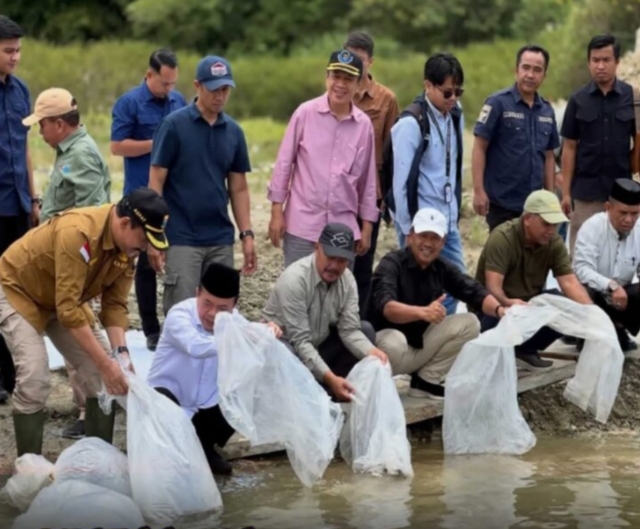 Kerinci – Bupati Kerinci Monadi & Gubernur Jambi Al Haris melakukan kegiatan Restocking penebaran benih ikan di Sungai Batang Merao sambil meninjau Operasional PT. KMH PLTA Kerinci
