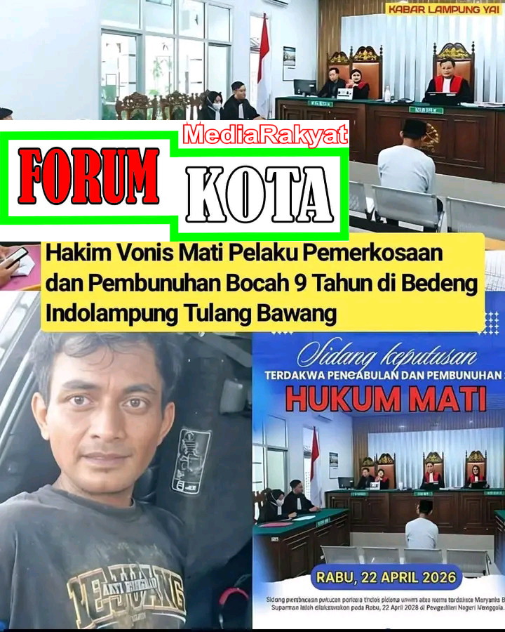 FORUMKOTA.ID |TULANG BAWANG – Pengadilan Negeri Menggala menjatuhkan hukuman mati terhadap Maryanto, terdakwa pembunuh dan pemerkosa anak inisial RAZ (10) di Kabupaten Tulang Bawang, Provinsi Lampung. Hukuman mati itu disertai dengan masa percobaan selama 10 tahun