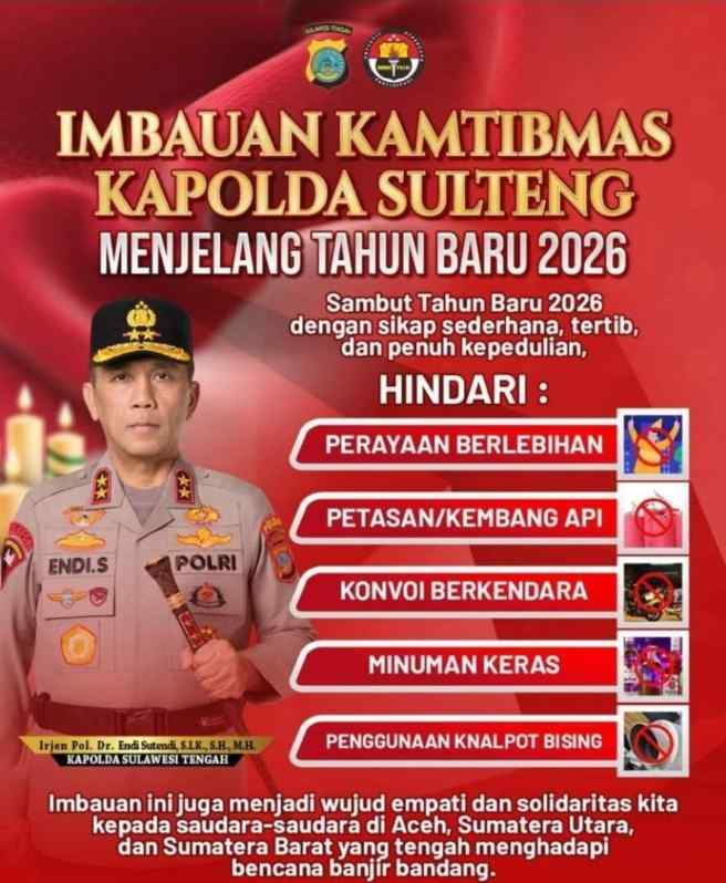 SULTENG, PALU – forumkota.id | Menjelang pergantian Tahun Baru 2026, Kapolda Sulawesi Tengah Irjen Pol Dr. Endi Sutandi, S.I.K., S.H., M.H., mengeluarkan imbauan keamanan dan ketertiban masyarakat (kamtibmas) kepada seluruh lapisan masyarakat agar menyambut tahun baru dengan sikap sederhana, tertib, serta penuh kepedulian sosial.