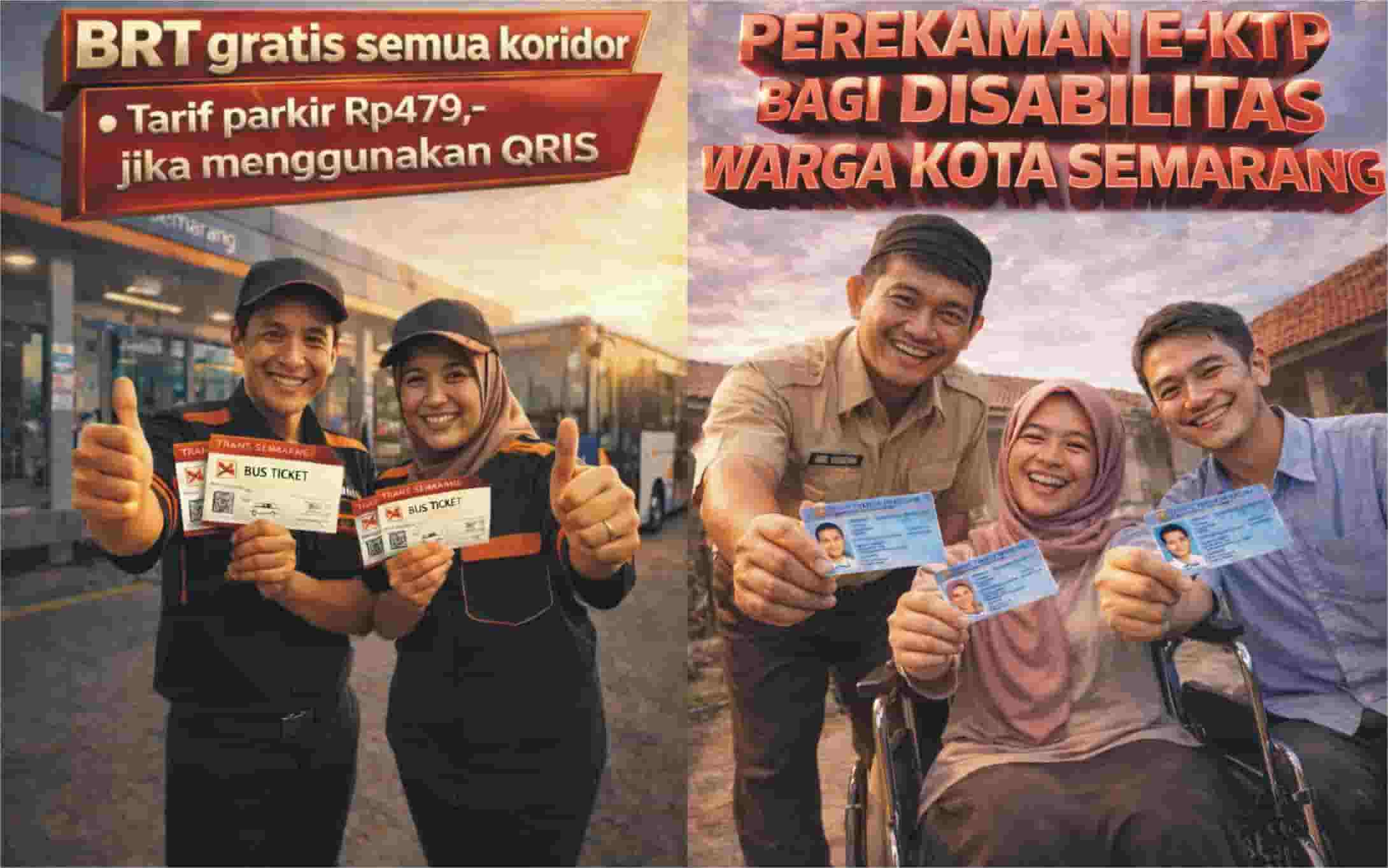 Untuk mobilitas, layanan BRT Trans Semarang digratiskan di seluruh koridor pada 1-5 Mei 2026. Tarif parkir juga didiskon menjadi Rp. 479,- bagi pengguna QRIS.