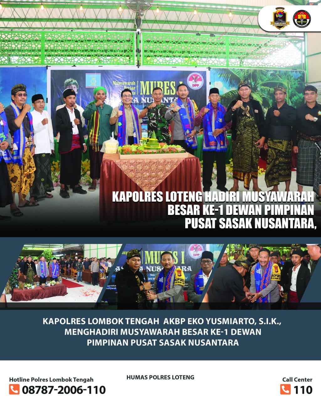 Forum kota, id. Lombok Tengah, NTB – Sabtu, 27 Desember 2025, Kapolres Lombok Tengah, AKBP Eko Yusmiarto, S.I.K, menghadiri Musyawarah Besar (Mubes) Ke-1 Dewan Pimpinan Pusat (DPP) Sasak Nusantara. Acara ini berlangsung di Lesehan 33 Telu-Telu, Praya, Lombok Tengah, NTB, dan dihadiri oleh sejumlah tokoh masyarakat, pengusaha, dan anggota Sasak Nusantara.