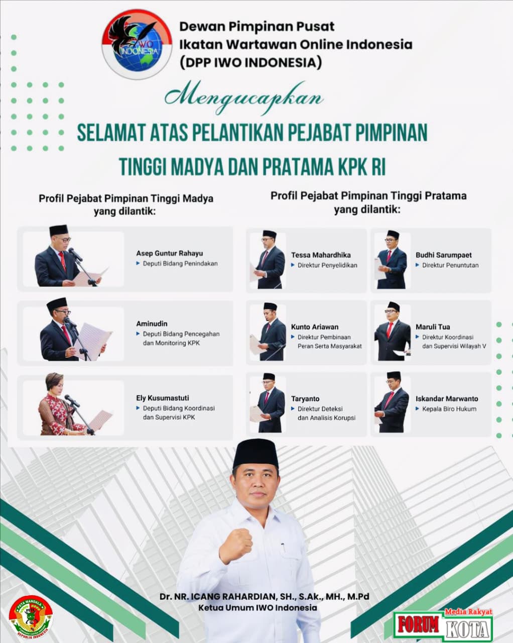 “Kami mengucapkan selamat bertugas kepada para Pimpinan Tinggi Madya dan Pratama yang telah resmi dilantik. Semoga momentum ini memperkuat sinergi antara KPK dengan seluruh elemen masyarakat, termasuk insan pers, dalam mengawal transparansi dan akuntabilitas di Indonesia,” ujar Ketua Umum IWO Indonesia.