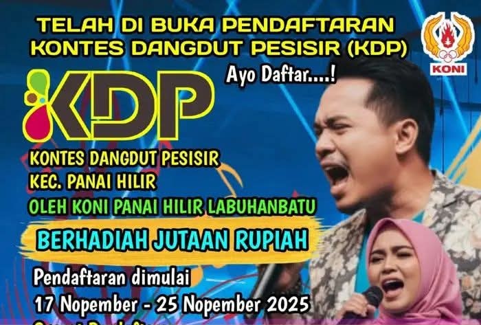 LABUHANBATU – Kontes Dangdut Pesisir (KDP) yang digelar KONI Panai Hilir resmi dibuka untuk umum. Ajang pencarian bakat tersebut menawarkan total hadiah jutaan rupiah dan mulai menerima pendaftaran peserta sejak 17 hingga 25 November 2025.