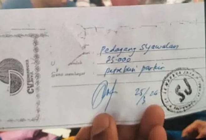 “Ya, saya mendapat laporan dari warga, adanya kuitansi untuk retribusi parkir pedagang syawalan dengan nominal sebesar Rp 25.000. Tapi kuitansi dan ada stempelnya itu dalam bentuk foto kopi, keterangannya ditulis dengan tinta biru dan bertanda tangan,” jelasnya sambil memperlihatkan kuitansi yang dimaksud.
