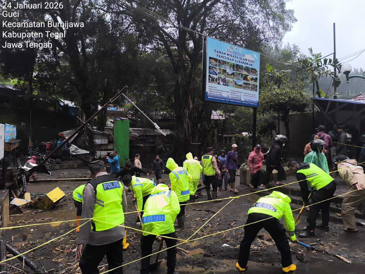 FORUMKOTA.ID | Tegal – Kepolisian Resor (Polres) Tegal melaksanakan kegiatan kerja bakti membersihkan lumpur akibat luapan sungai yang melanda wilayah Guci, Kabupaten Tegal, pada Sabtu, 24 Januari 2026. Kegiatan ini dilaksanakan sebagai bentuk kepedulian Polri terhadap masyarakat yang terdampak bencana alam.