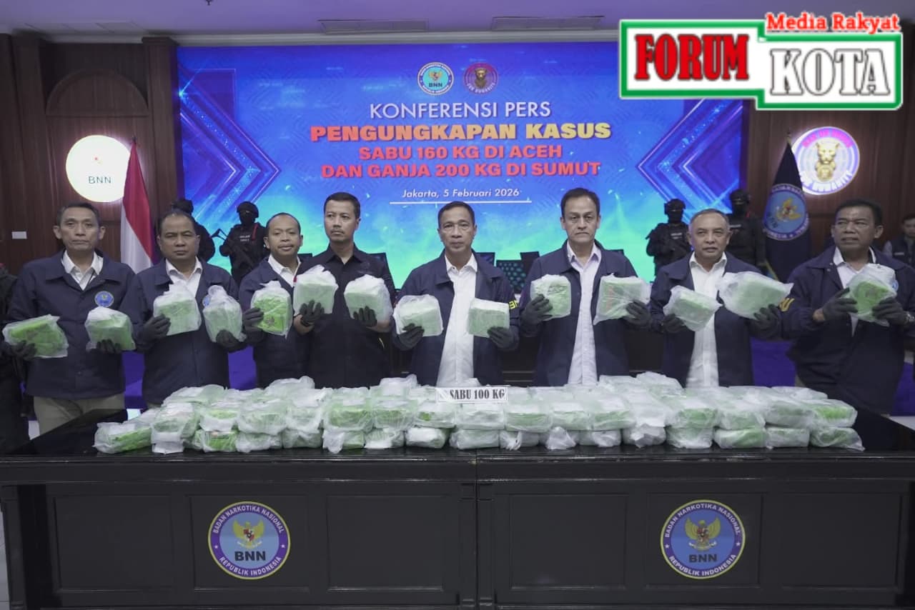 Jakarta -FORUM KOTA.ID, 5 Februari 2026,Badan Narkotika Nasional (BNN) kembali menunjukkan komitmennya dalam memerangi peredaran gelap narkotika dengan menggagalkan dua upaya besar penyelundupan narkotika dari Jaringan Aceh. Dalam operasi terpisah di wilayah Aceh Timur dan Sumatera Utara, BNN bersama jajaran berhasil mengamankan barang bukti narkotika berupa ±160 Kg sabu serta ±200 Kg ganja, sekaligus menangkap sejumlah tersangka yang diduga kuat terlibat dalam jaringan peredaran narkotika lintas daerah tersebut.