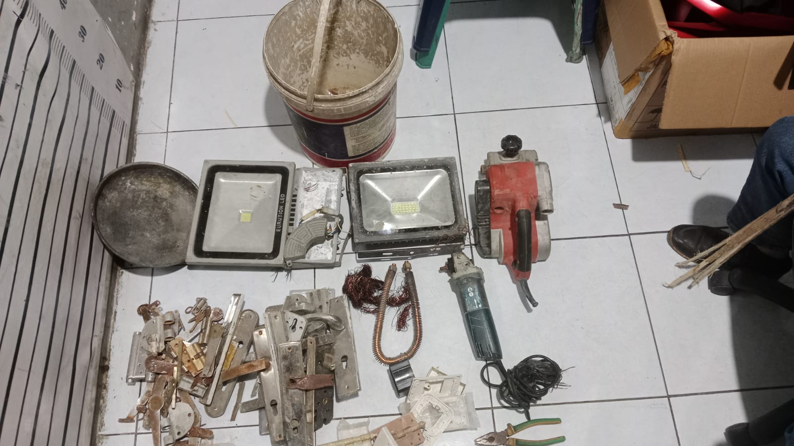 Dari tangan pelaku, polisi berhasil menyita sejumlah barang bukti hasil curian, di antaranya: 1 unit alat ketam kayu, 1 unit mesin gerinda, 2 buah lampu sorot, 5 pasang handle pintu, 1 gulung kabel tembaga dan sejumlah potongan besi serta peralatan lainnya.