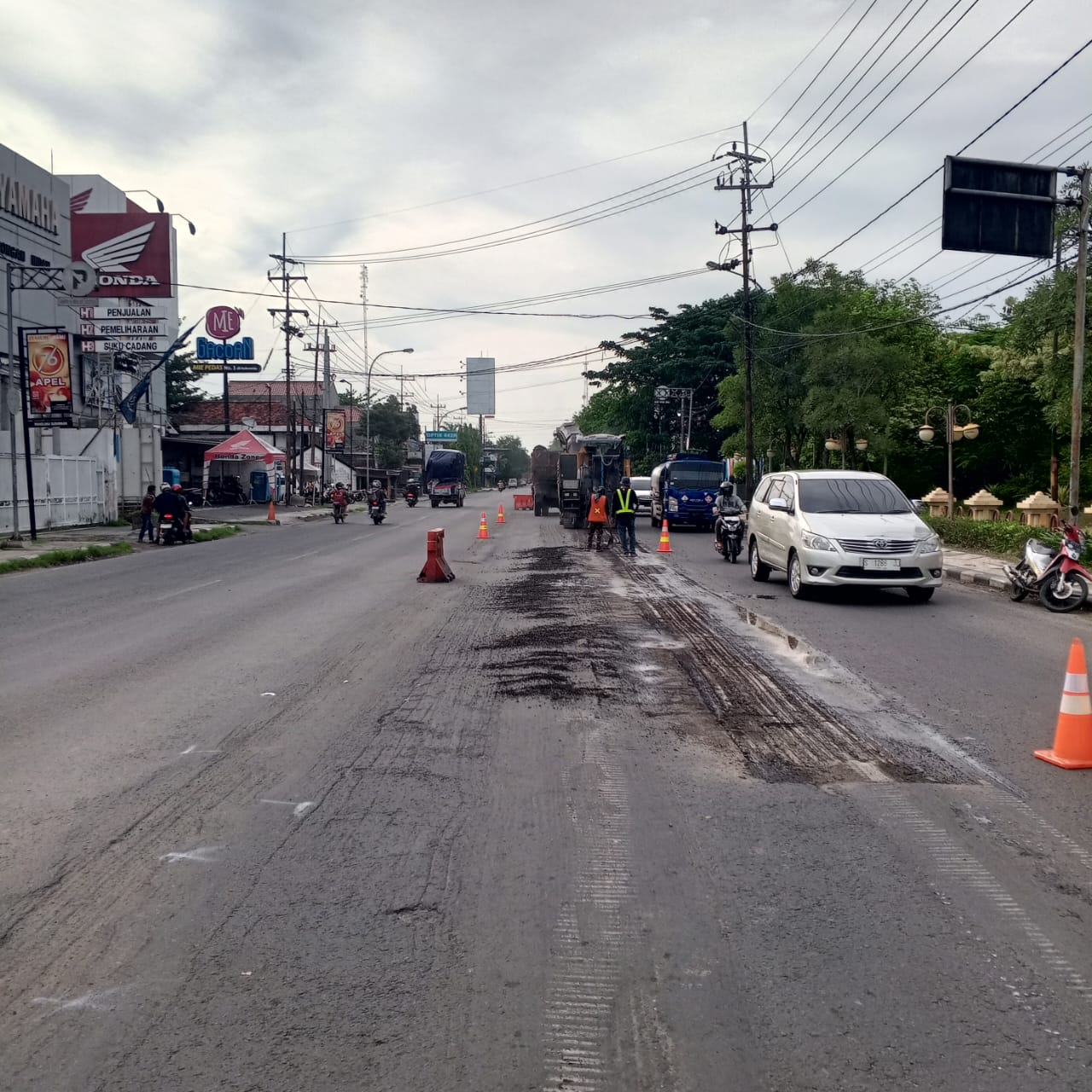 Pekerjaan perbaikan tampak dilakukan dengan pengupasan lapisan aspal lama menggunakan alat berat, disertai pengaturan lalu lintas menggunakan cone dan water barrier. Sejumlah petugas terlihat mengatur arus kendaraan agar tetap lancar meski sebagian badan jalan digunakan untuk pekerjaan.