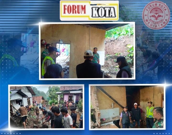 Tak hanya meninjau, petugas kepolisian bersama aparat kecamatan dan warga setempat langsung bahu-membahu bergotong royong membersihkan material longsoran yang menumpuk di area rumah korban.