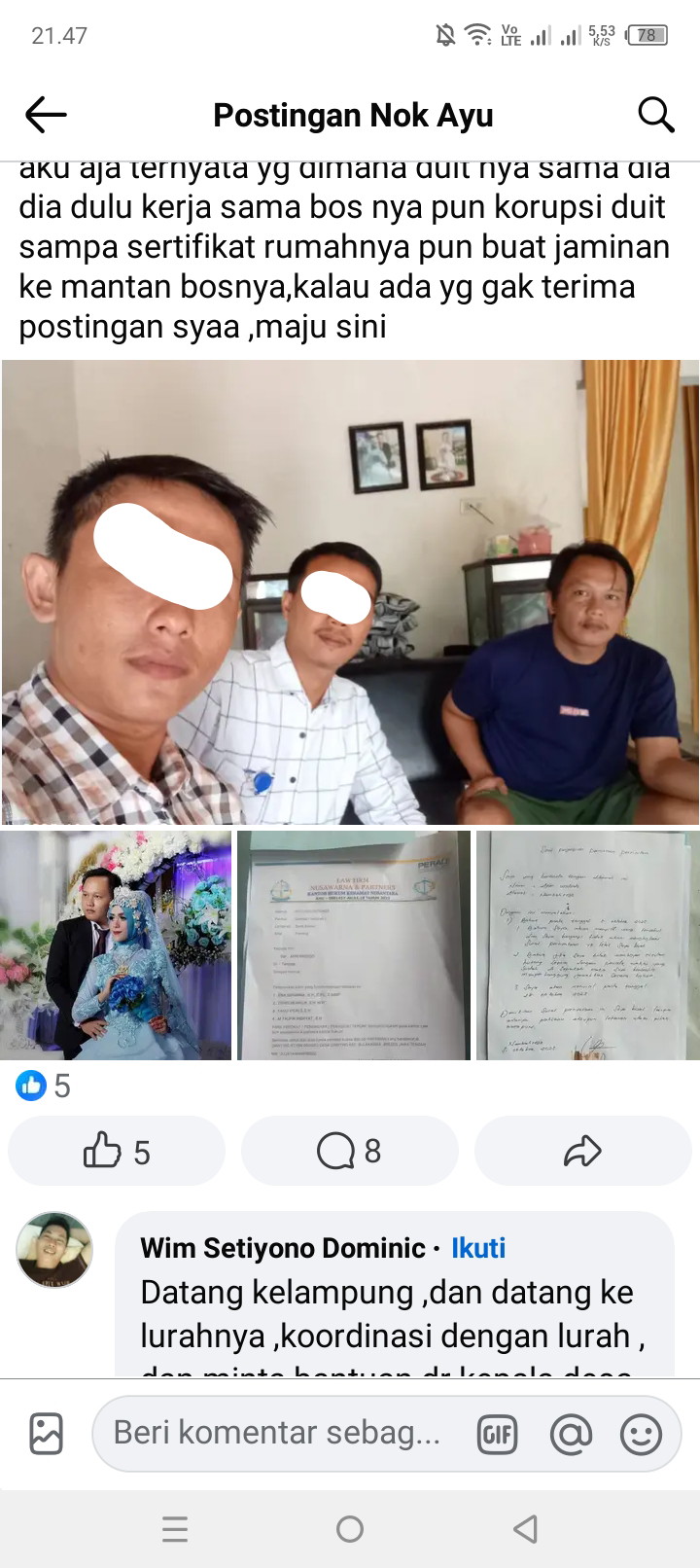 FORUM KOTA|LAMPUNG TENGAH – Unggahan status Facebook dari pemilik akun Nok Ayu Hera diduga telah melanggar undang-undang ITE dan pencemaran nama baik sehingga membuat tidak nyaman Taufik yang berdomisili di punggur Lampung Tengah